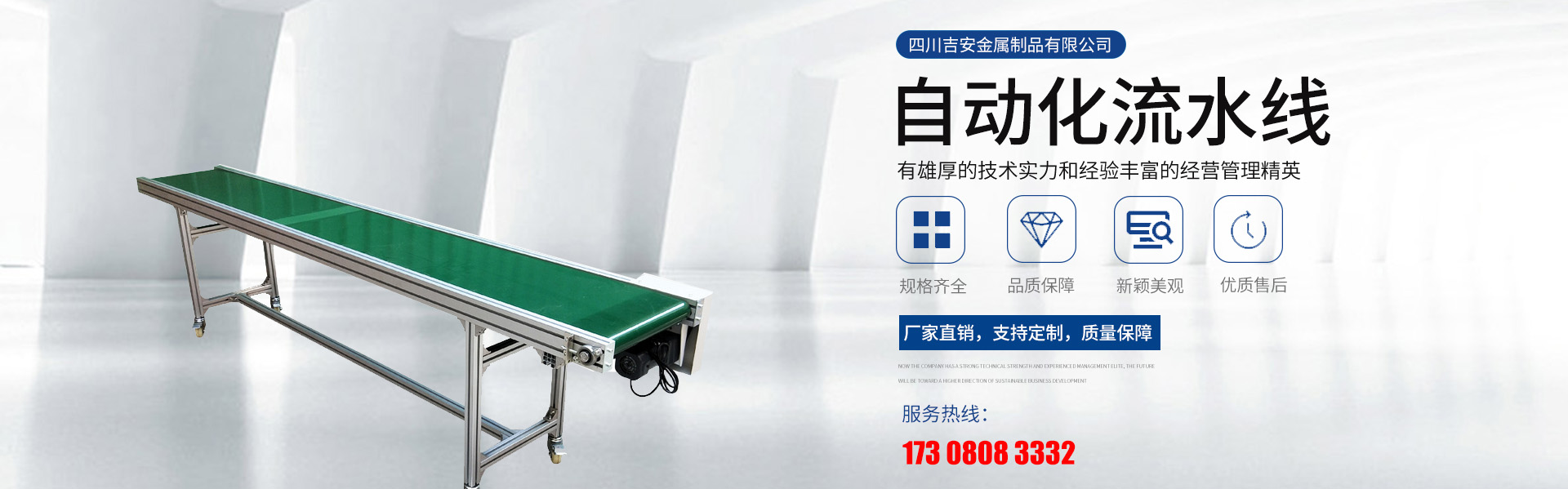 四川吉安金屬制品有限公司是集工業(yè)鋁型材及配件、貨架、工作臺(tái)、皮帶輸送線、自動(dòng)化流水線、線棒精益管及扣件、鈑金和鋁合金流利條、鋁線棒及扣件、倉(cāng)儲(chǔ)設(shè)備、物流器具、周轉(zhuǎn)臺(tái)車、工位器具、非標(biāo)器具設(shè)...
